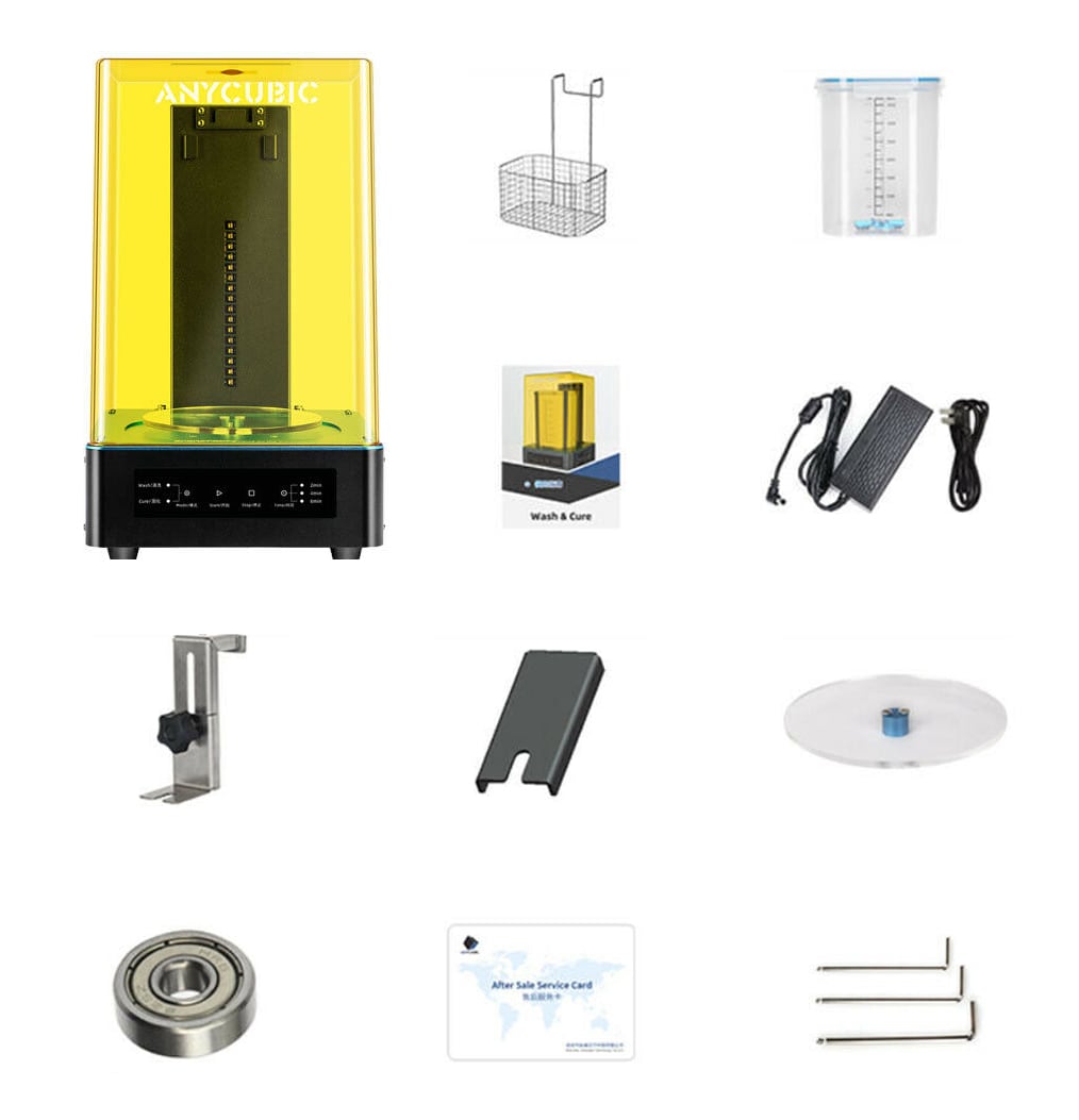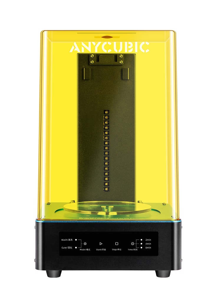 УФ-камера и Мойка Anycubic Wash and Cure - это универсальное устройство 2 в 1, мойка и УФ-отвердитель изделий напечатанных из фотополимерной смолы. В верхнюю часть помещается печатный стол с изделием и закрепляется винтом, и опускается в емкость (входящую в комплект). Высоты хватает для самого большого изделия, напечатанного на 3д принтере Anycubic Photon S. Для достижения максимальной засветки изделия платформа вращается на 360°, сама область накрывается защитным коробом не пропускающего ультрафиолет. Также автоматизирована процесс промывки и после окончания процесса мойки, платформа с изделием поднимается для избегания подтеков.