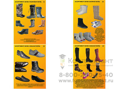Плакаты ПРОФТЕХ Ассортимент обуви (4 пл, винил, 70х100) – наглядное пособие для изучения видов и моделей обуви в образовательных учреждениях. Идеально подходит для уроков труда, рисования и дизайна одежды.