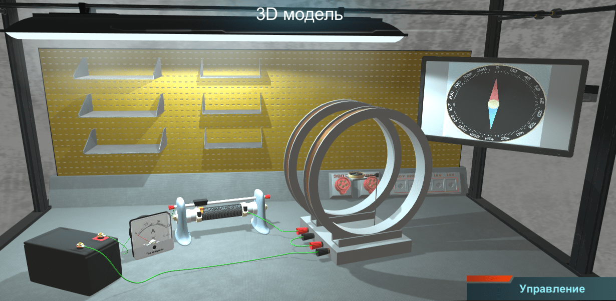 Практикум позволяет в трехмерной среде изучать воздействие магнитного поля колец Гельмгольца на стрелку компаса в среде магнитного поля Земли, путем визуализации магнитных силовых линий.